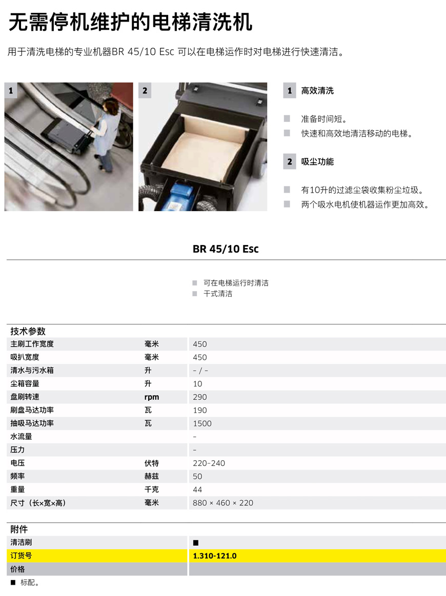 嘉洁环保提供德国卡赫扶梯清洗机BR 45/10 ESC,刷子宽度:450 mm,尘箱容量:10 l,抽吸马达功率:1500 w。价格实惠!!