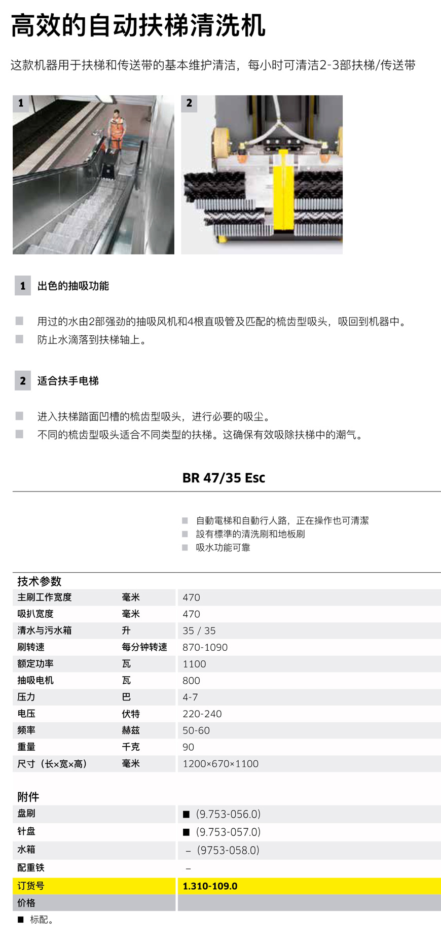 嘉洁环保提供德国卡赫扶梯清洗机BR 47/35 Esc,吸扒宽度:470 mm,清水和污水箱:35/35 l,压力:4-7 bar。价格实惠!