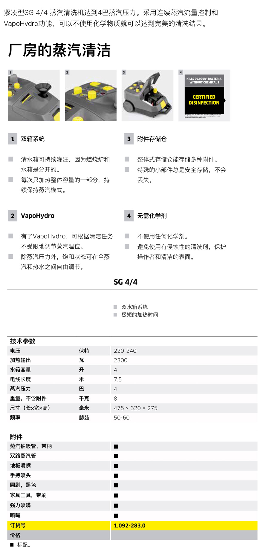 德国卡赫蒸汽清洁机SG 4/4,紧凑型,蒸汽工作压力:4 bar,水箱容量:4 l